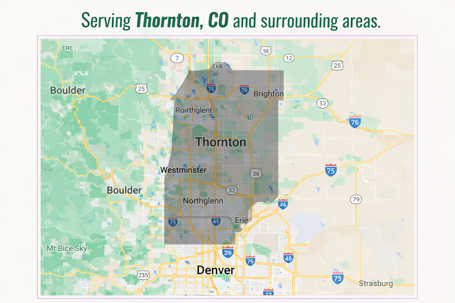 Proudly serving Thornton, Colorado and surrounding communities, including Westminster, Northglenn, Brighton, Broomfield, Erie, and nearby areas throughout the North Denver Metro.
